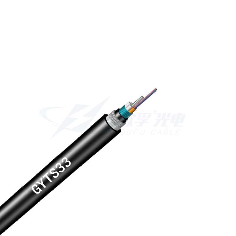 GYTS33光缆的结构是将250μm光纤套入高模量材料制成的松套管中,松套管内填充防水化合物,缆芯的中心是一根金属加强芯,对于某些芯数的光缆来说,金属加强芯外还需挤上一层聚乙烯 垫层,松套管围绕中心加强件绞合成紧凑的圆形缆芯,缆芯内的缝隙充以阻水填充物,涂覆上钢带纵包后挤一层聚乙烯内护套,再纵包上单层细圆钢丝铠装后,较终挤制聚乙烯外护套成缆。